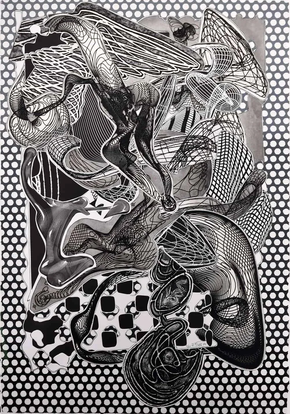 In Riallaro, Frank Stella combines multiple printmaking techniques —screenprint, lithograph, etching, relief, aquatint, and collagraph— to construct a complex and dynamic composition that embodies his signature exploration of abstraction and dimensionality. Created in 1994, this work exemplifies Stella’s late-career interest in layering form, texture, and optical rhythm. The intricate patterns and interlocking geometries evoke movement and depth, while the interplay of black, white, and tonal variation amplifies its sculptural illusion. As with much of Stella’s work from this period, Riallaro blurs the boundaries between painting, print, and relief, reaffirming his ongoing dialogue between structure and spontaneity.